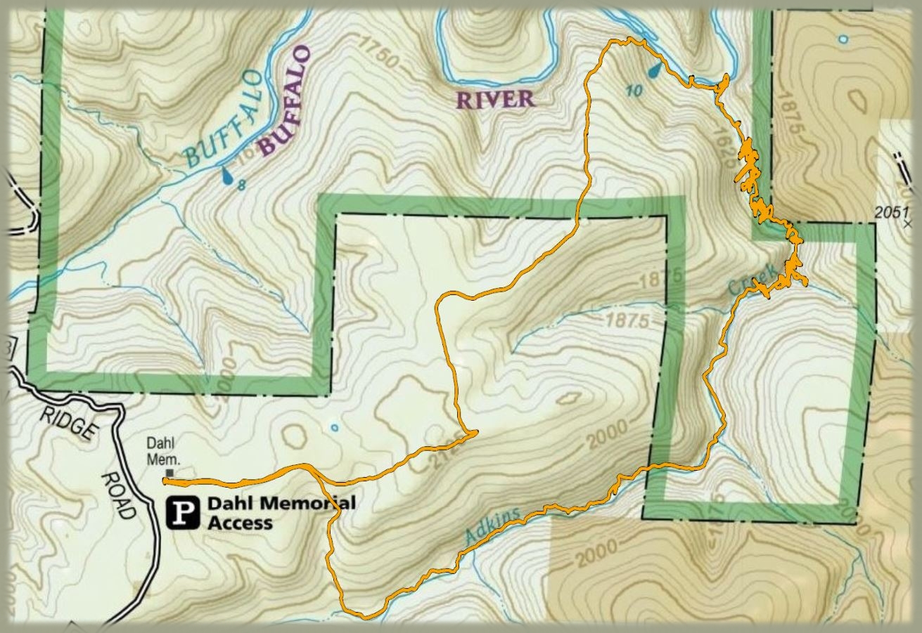 I will explore another tributary of the Upper Buffalo this week...Adkins Creek. Temp 45 degrees on arrival to the parking spot that serves the Adkins Falls area. The woods be dark at this time-o-day so headlamp blazing...into the shrubbery I go. I entered the creek valley well above the wilderness area to be sure nothing cool was missed up there. Nothing was missed...for there was not much to see until I crossed the boundary line...and it was like night and day as I stepped across into protected territory....although is was still pre-dawn...and not actually night or day. This creek has its own unique personality while retaining the usual bedrock here and boulder there topography. A fall was passed on the left from a feeder creek...possibly Leaning Log Falls?...not sure...but it did not attract me so I went on until Adkins falls was on the right. I checked it out and was not favorably affected by its sight. It is a double drop fall with a pool above and below...with water falling between these. The stream was followed downward until the Buffalo was encountered and a left turn was made here and an upstream track was partaken of. I was forced up the slope and decided to just go ahead and make my way back towards the parking area. Temp maxed out at 75 with a sunny sky. All went well. In at 5:30. out by 12:30, distance about 8.5 miles. I liked this creek but not as much as Whitaker Creek.
